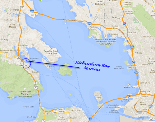 | From the South: (San Francisco etc.) Take 101 north to Sausalito/Marin City exit (at the bottom of the grade and the north end of town). Stay in the left hand lane of the off ramp as it curves around and ends at a signal light. Turn left and proceed straight ahead into the marina complex. The Harbor (mini-mall with Mike's Bikes, Harbor Cafe, Market & Deli, Laundry) will be on your left. (See Detail Below)