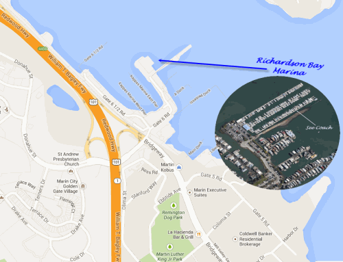 From the North: (San Rafael, Richmond, San Rafael Bridge, etc.) Take 101 south to the Sausalito/Marin City exit (at the north end of town). At the end of the exit, turn left. Stay in the left hand lane going under the fwy. At the next signal proceed directly across Bridgeway into the marina complex onto Gate Six Road. The Harbor (mini-mall with Mike's Bikes, Harbor Cafe, Market & Deli, Laundry) will be on your left. (See Detail Below)